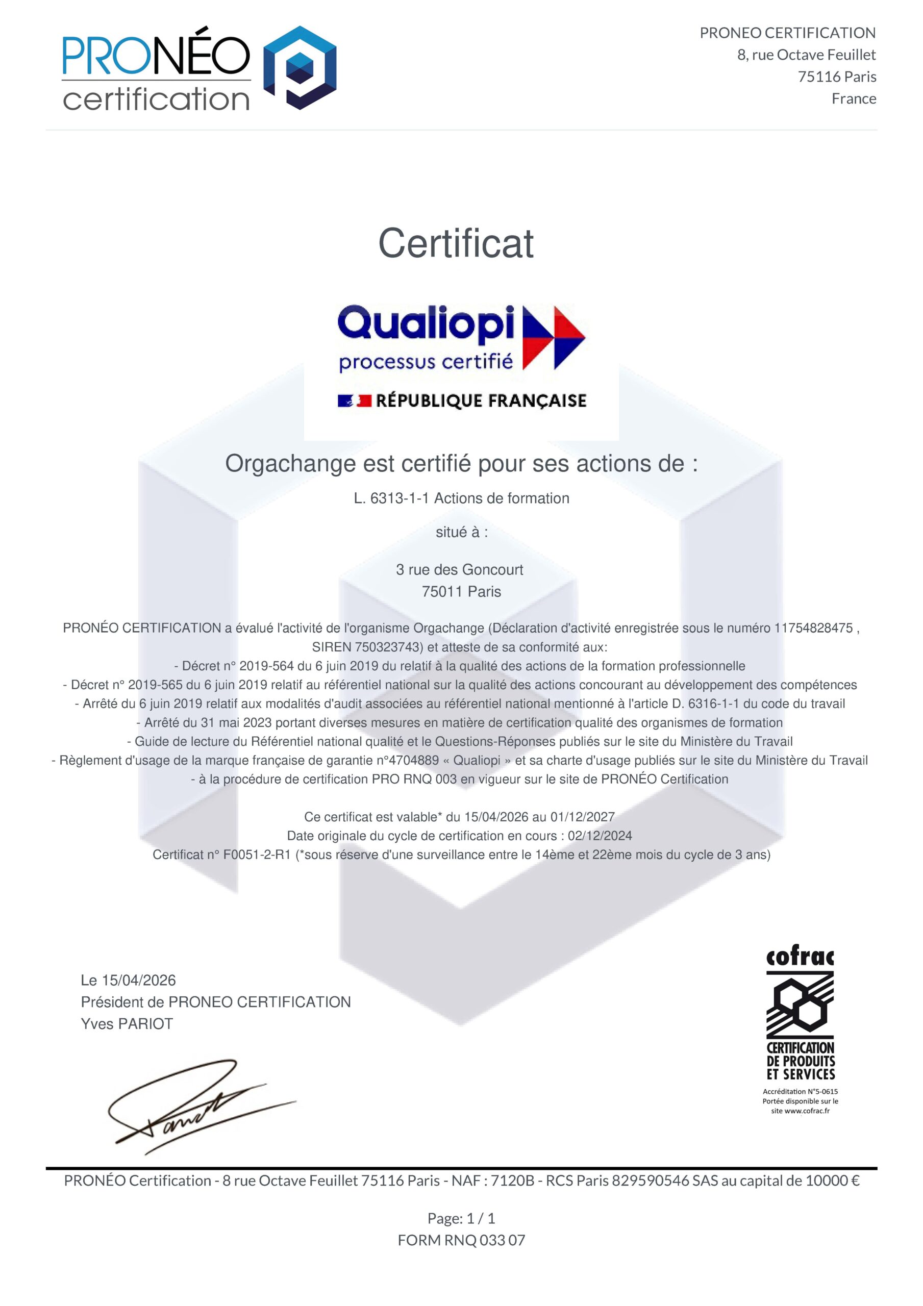 Orgachange est certifié Qualiopi depuis le mois de décembre 2020. Cette certification valide le processus Qualité d’Orgachange autour des formations dispensées, de la prise en compte des besoins des apprenants jusqu’à l’évaluation par les différentes parties prenantes. Vous trouverez ci-dessous le certificat délivré par l’organisme Pronéo Certification.